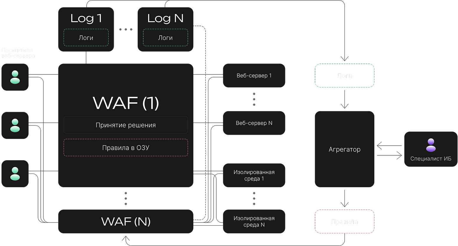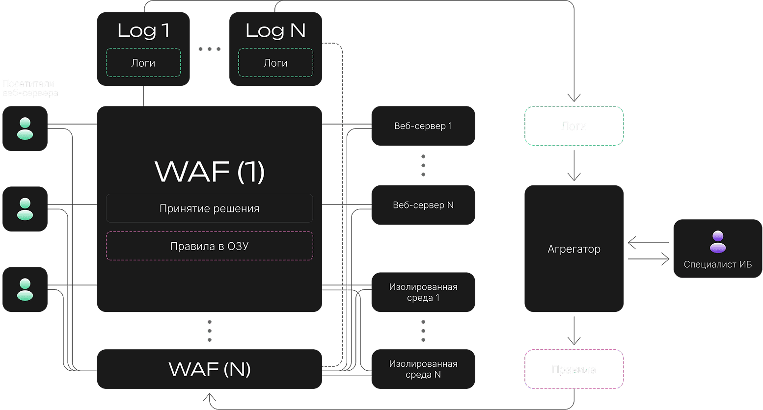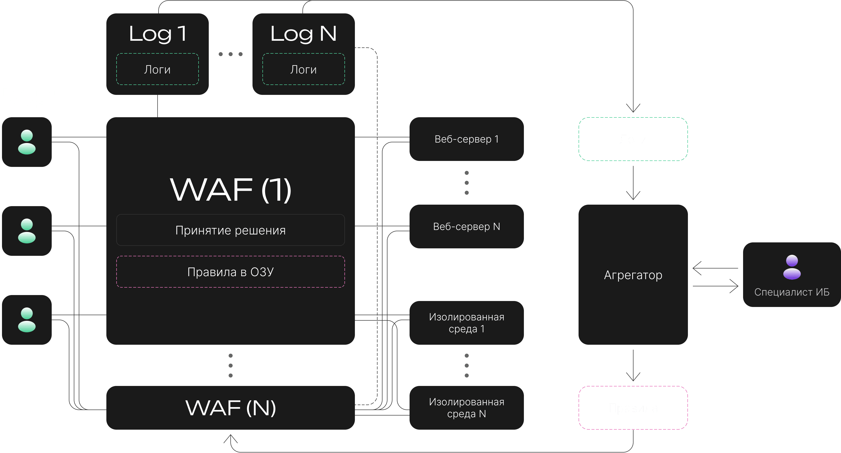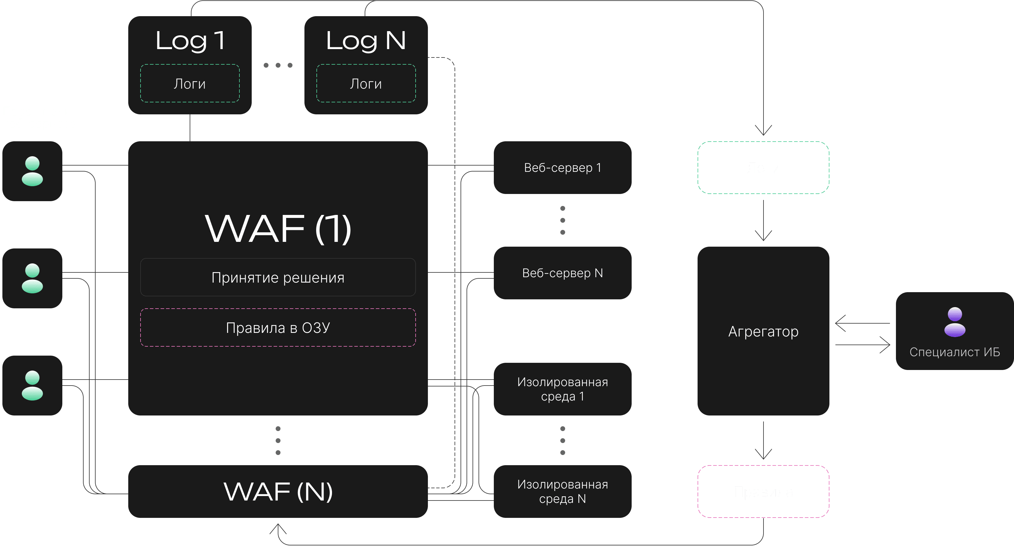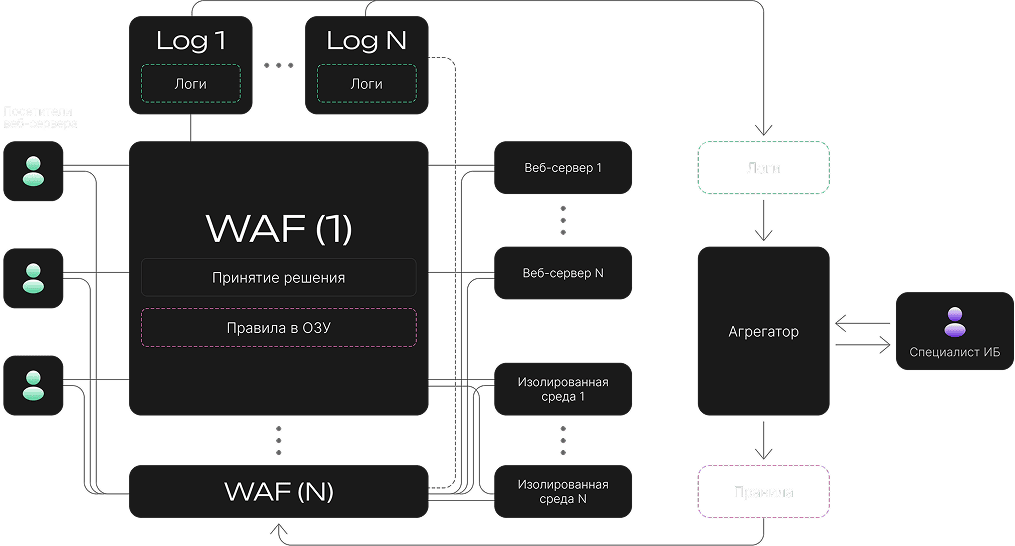 Архитектура WAF построена по принципу независимых фильтрующих узлов с централизованным управлением
